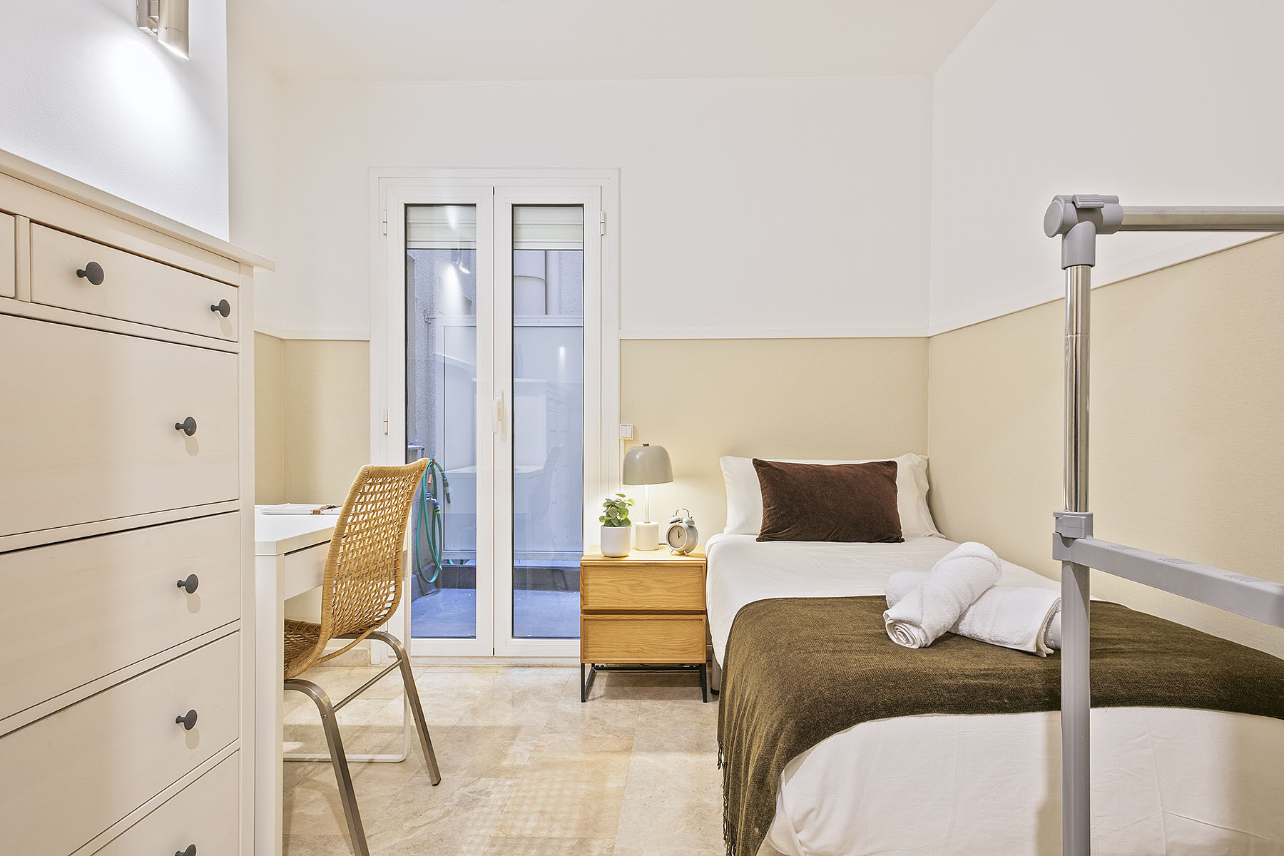 El apartamento consta de una habitación doble con balcón y baño privado, una habitación individual con un pequeño patio privado, y dos habitaciones dobles las cuales disponen de dos camas individuales que pueden ser utilizadas para una o dos personas.