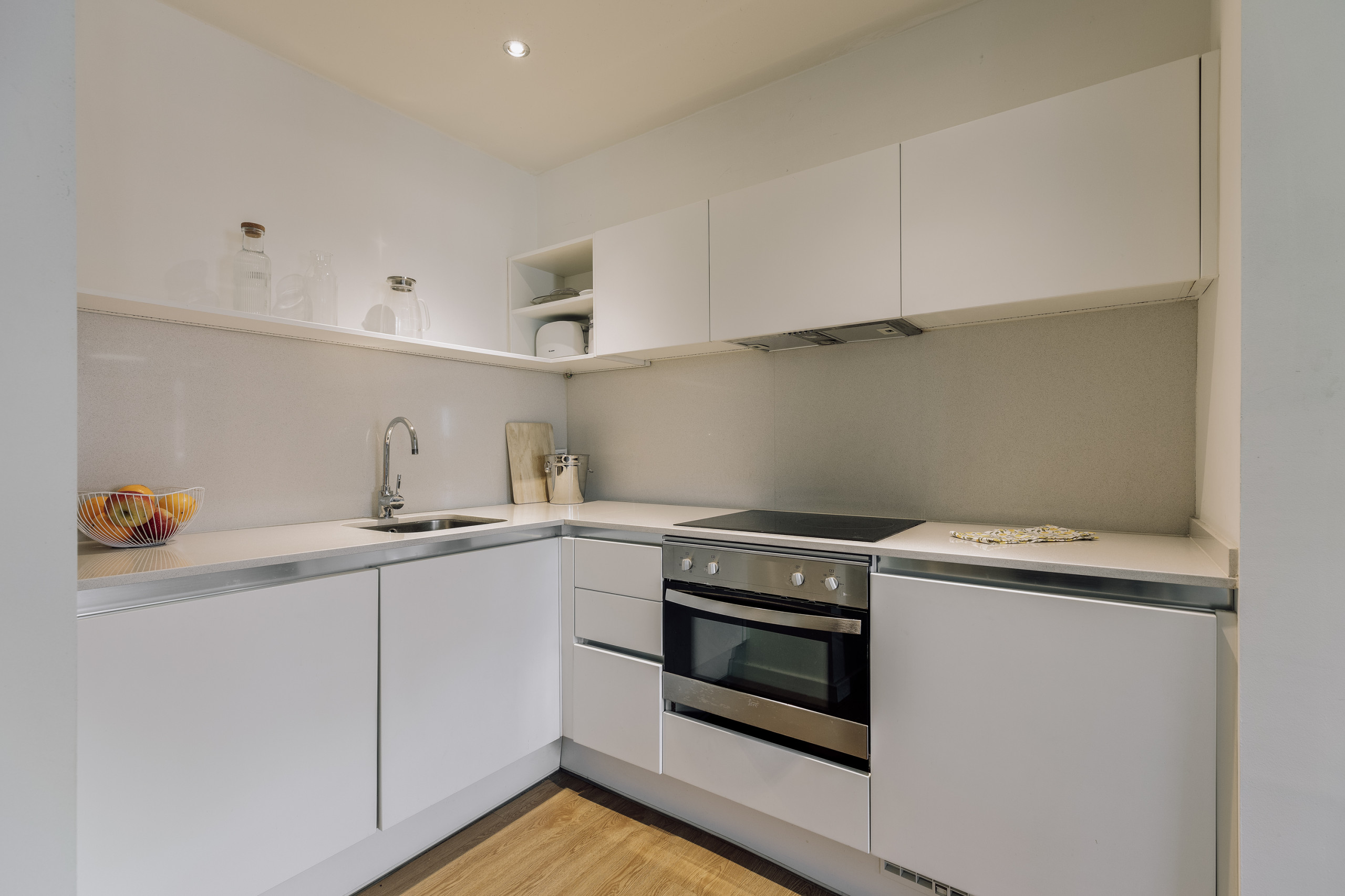 El salón dispone de televisión de pantalla plana, mesa comedor con sillas y acceso a un balcón que da a una famosa calle comercial del centro de la ciudad. La cocina se encuentra integrada y completamente equipada.