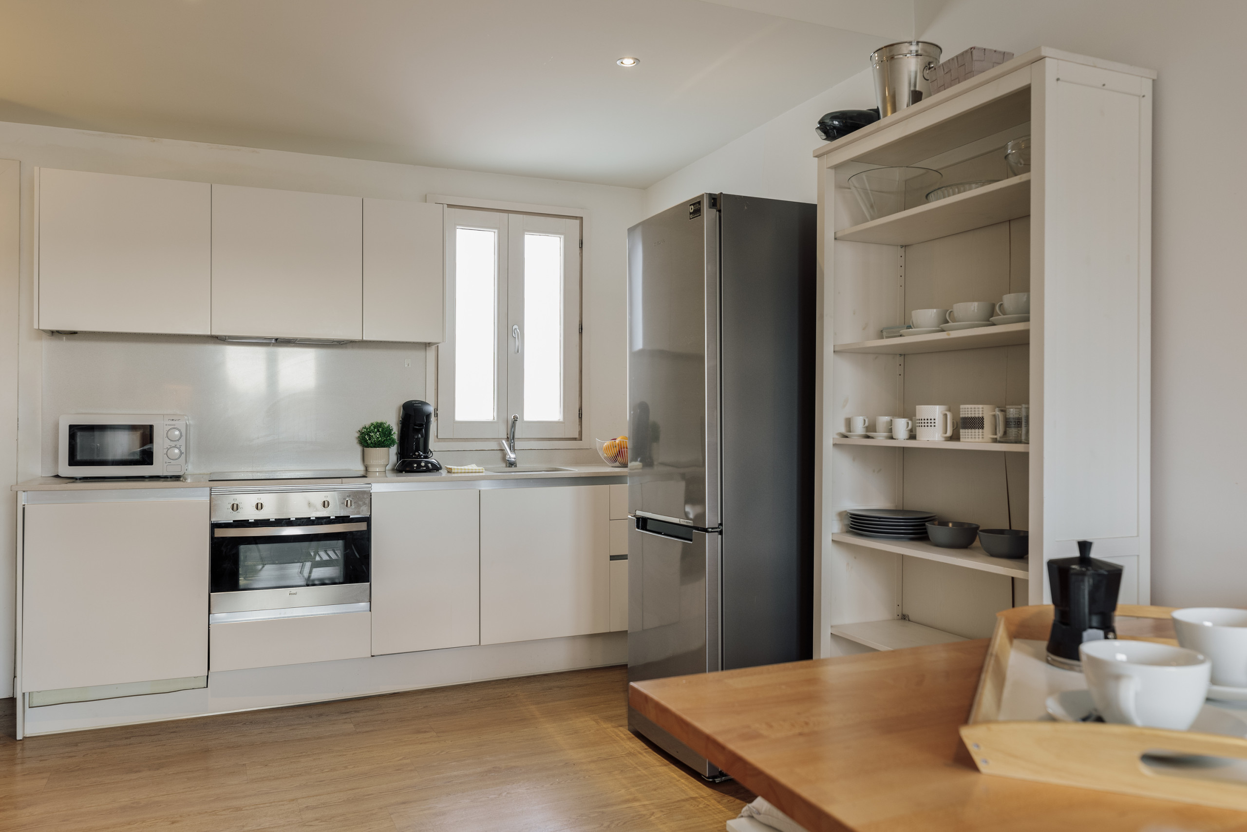 La cocina está totalmente equipada con nevera, congelador, lavadora, lavavajillas, microondas, cafetera y todos los utensilios necesarios para preparar comidas en casa. Además, dispone de plancha y tabla de planchar. Se encontrará el apartamento equipado con toallas y ropa de cama.