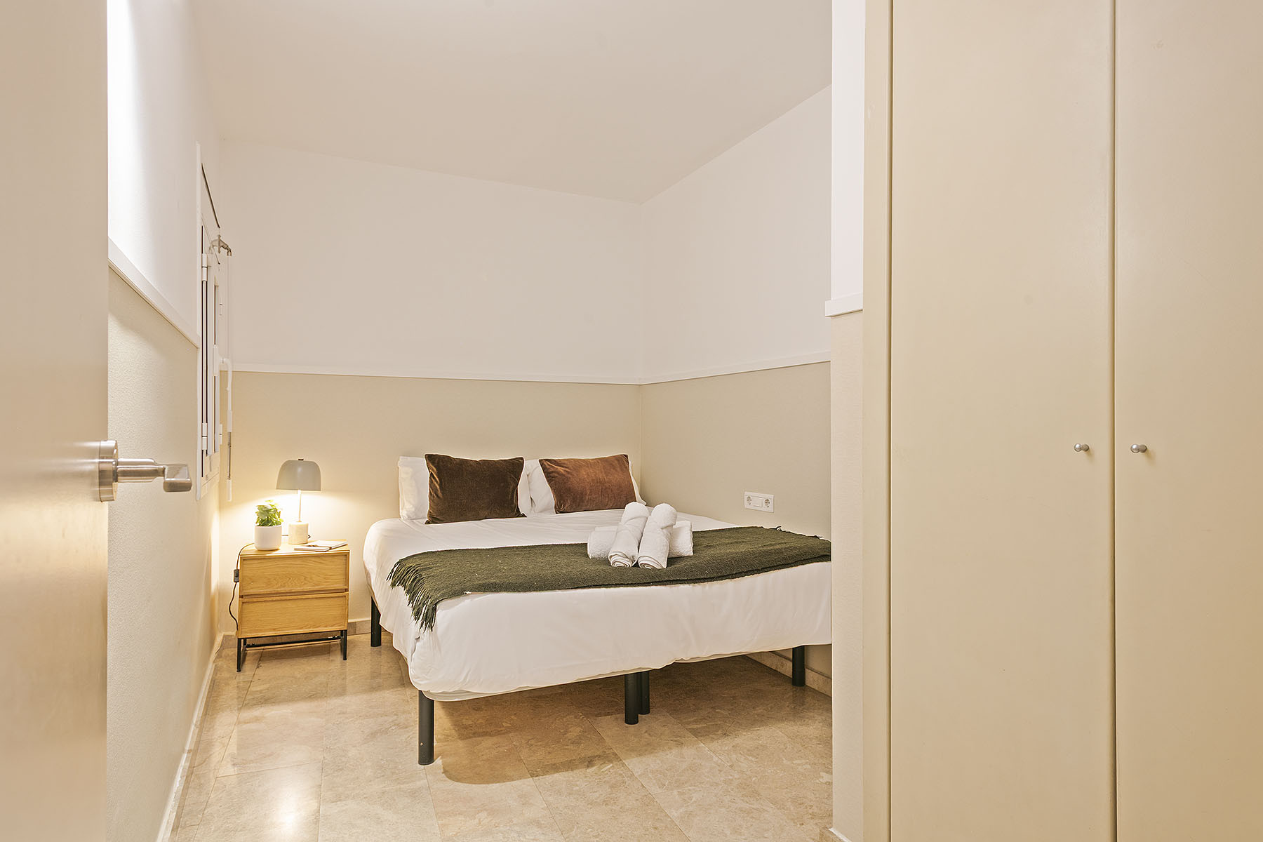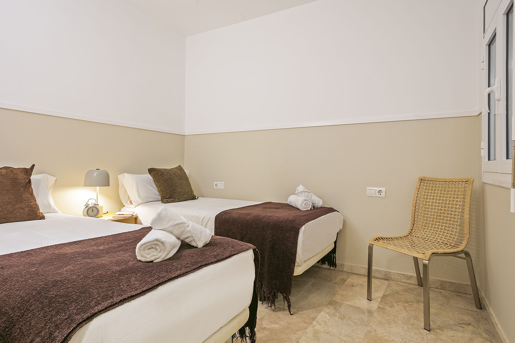 Die Wohnung besteht aus einem Doppelzimmer mit Balkon und eigenem Bad, einem Einzelzimmer mit einem kleinen privaten Innenhof und zwei Doppelzimmern, die jeweils zwei Einzelbetten haben, die für eine oder zwei Personen genutzt werden können.