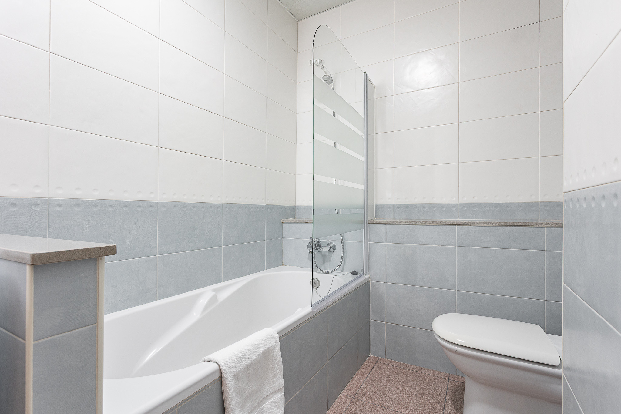 The main bedroom has a double bed and spacious wardrobes. The second bedroom has 2 single beds. The elegant bathroom, complete with a shower cabin, has towels to use upon your arrival at the apartment.