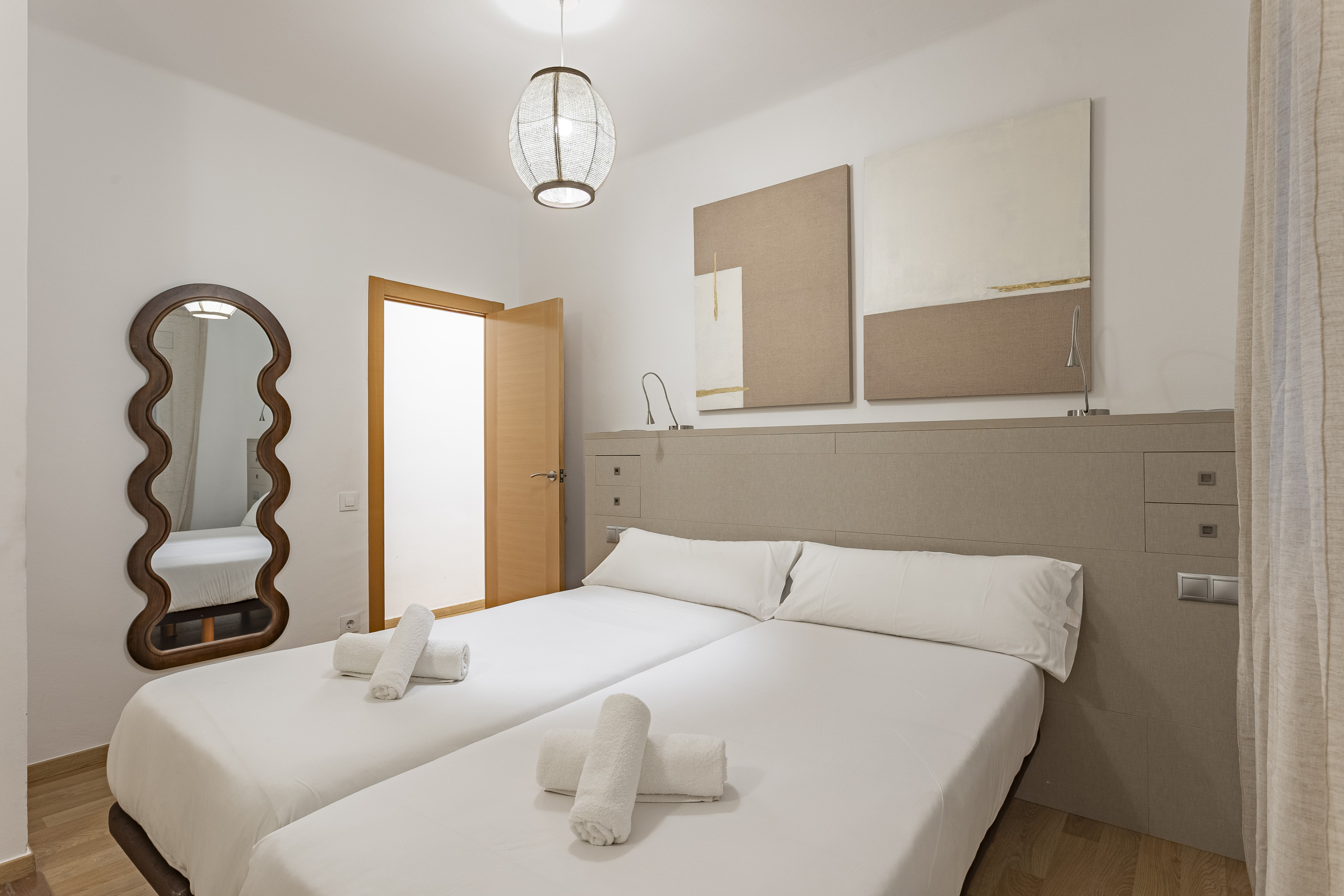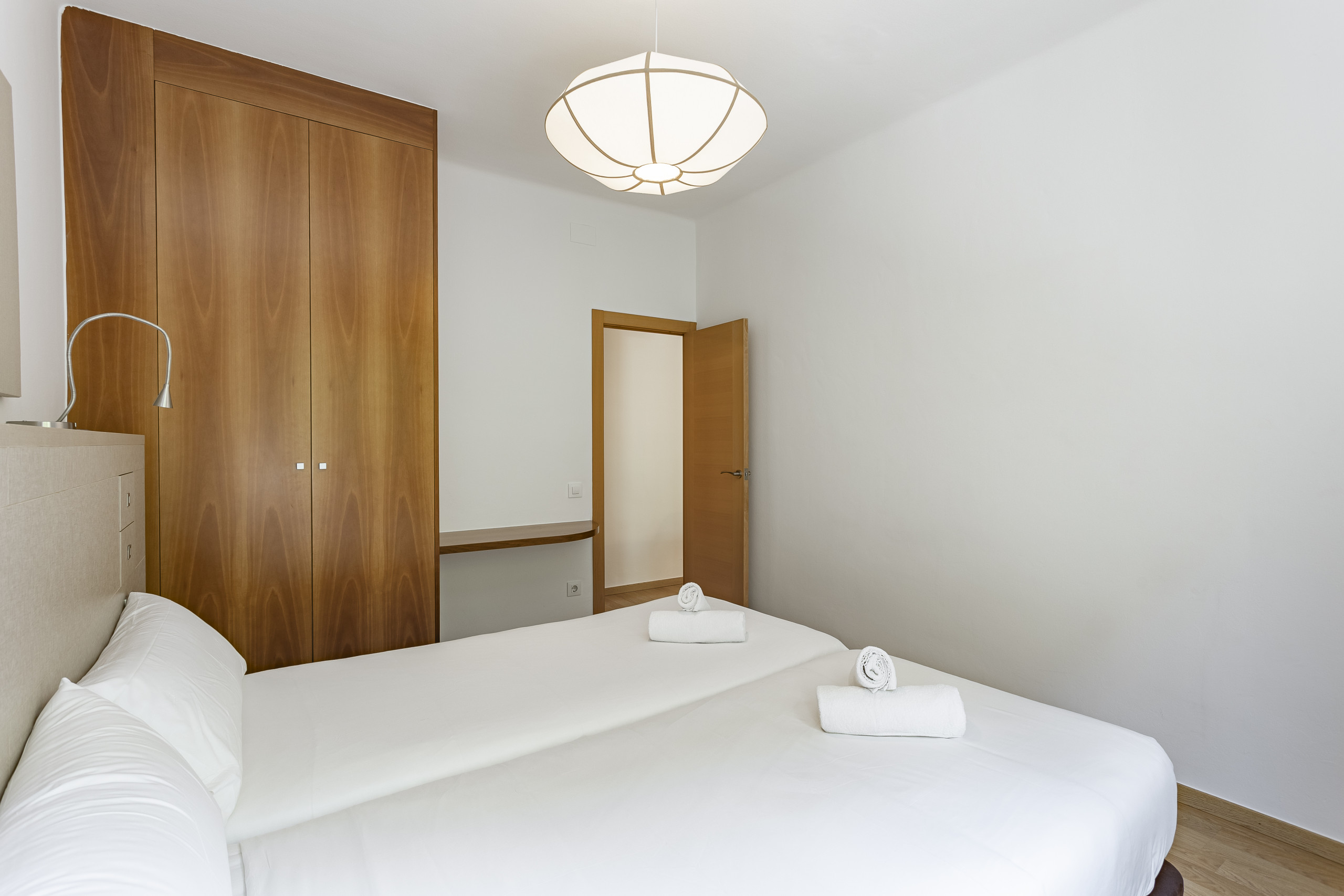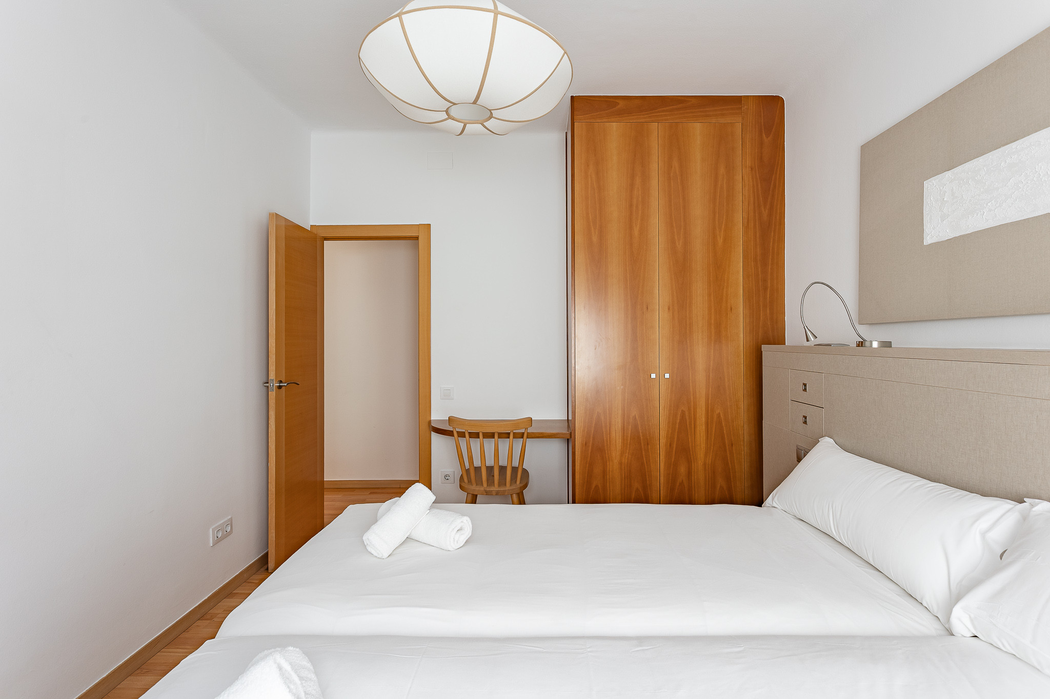La camera da letto principale dispone di un letto matrimoniale e di ampi armadi. La seconda camera da letto ha un letto singolo. L'elegante bagno, completo di cabina doccia, è dotato di asciugamani da utilizzare al momento del vostro arrivo nell'appartamento.