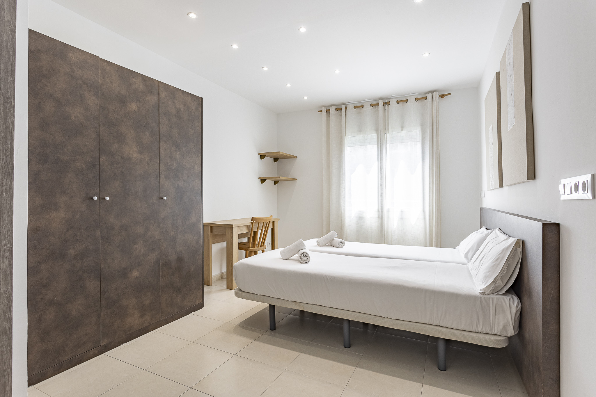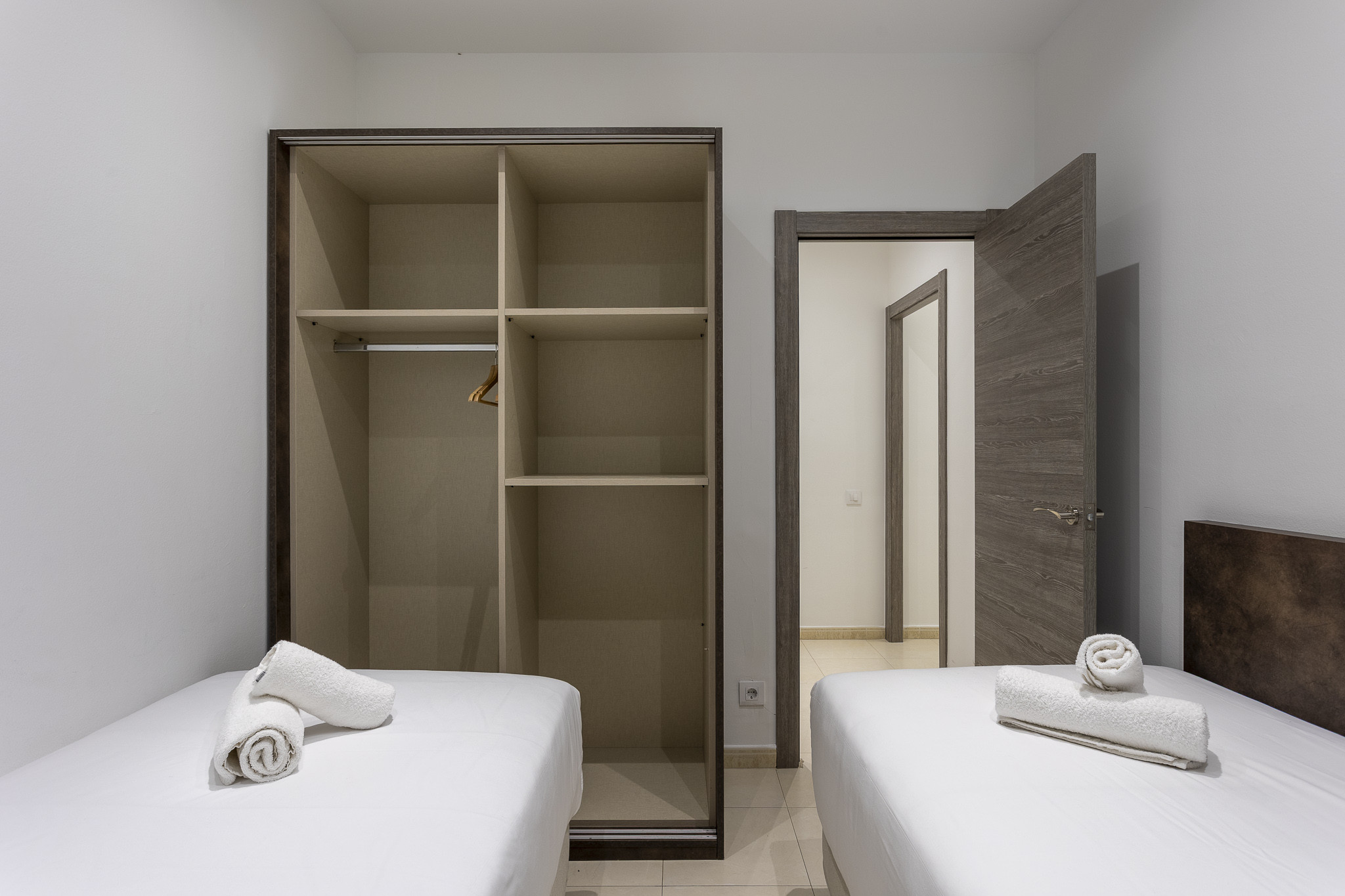 La camera da letto principale dispone di un letto matrimoniale e di ampi armadi. La seconda camera da letto ha un letto singolo. L'elegante bagno, completo di cabina doccia, è dotato di asciugamani da utilizzare al momento del vostro arrivo nell'appartamento.