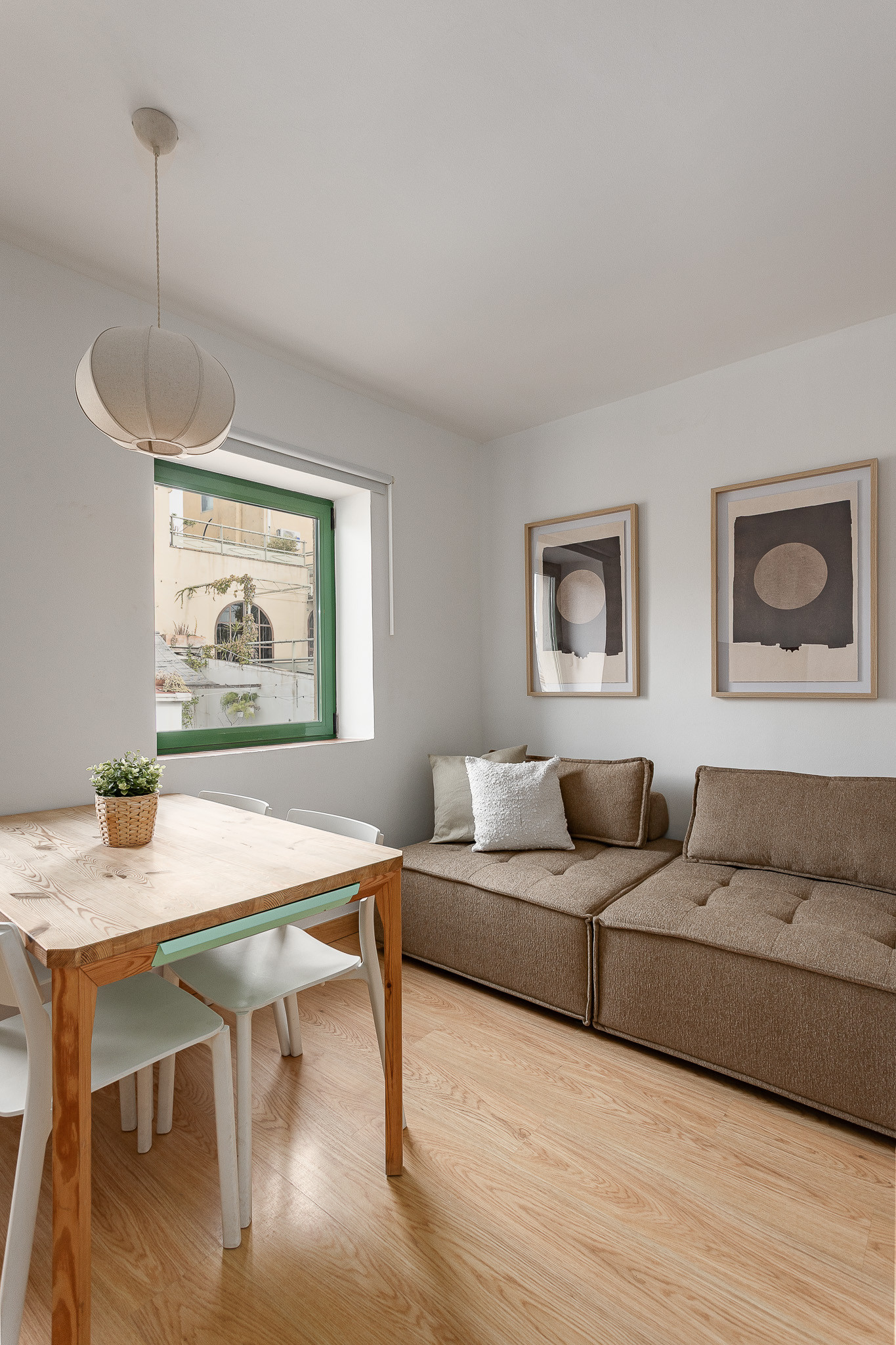 Il salone dispone di televisione a schermo piatto, tavolo da pranzo con sedie e accesso a un balcone che si affaccia su una famosa strada commerciale nel centro della città. La cucina è integrata e completamente attrezzata.